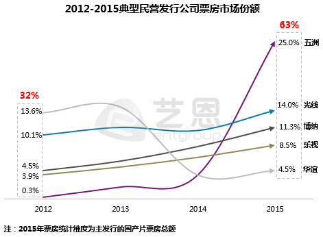 根據(jù)藝恩研究報告顯示,華誼兄弟從2012年的13.6%的市場份額一路跌至2015年的4.5%,而由萬達影視牽頭的五洲發(fā)行市場份額一路從0.3%飆升至25%,華誼的電影份額被一路碾壓。而萬達影視也即將以注入上市公司的方式登陸A股市場。