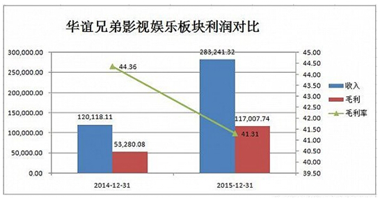 據(jù)界面報道,根據(jù)財報顯示,華誼兄弟2015年影視娛樂版塊營業(yè)收入較上年同期相比增135.80%,達到28.32億元,營業(yè)成本較上年同期增長135.80%,達到16.62億,毛利率較上年減少了3.05%,達到41.35%。在報告期內(nèi),公司上映的主要是《奔跑吧兄弟》《天將雄師》《梔子花開》、《命中注定》《尋龍訣》《老炮兒》等16部,電影的總票房約43億。