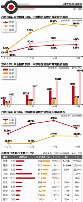 不過,整個4月,作為一線城市的北京和上海竟無一幅地塊出讓,而到了5月,北京、上海、蘇州、南京、杭州開始集中供地,僅這5個城市當月的土地出讓金就高達1101億元。作為中部城市的合肥、武漢、鄭州等地卻放慢了供地節(jié)奏,這成為導致中部地區(qū)房地產(chǎn)開發(fā)投資增速在5月首次調(diào)頭向下的主因。