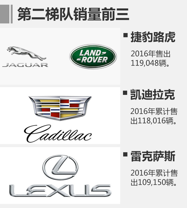 而包括捷豹路虎、凱迪拉克、雷克薩斯、沃爾沃、英菲尼迪、林肯和謳歌組成的豪華品牌第二梯隊,2016年總銷量為520,354輛,占整個豪華車市場23.9%。注:保時捷品牌定位問題,不算在第二梯隊內(nèi)。