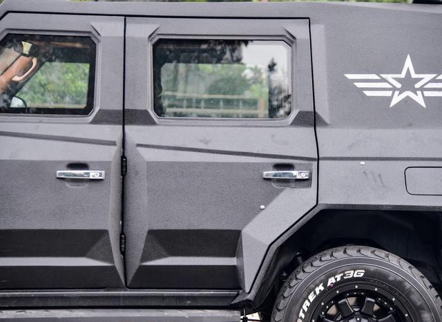 車身表面使用了亞光色涂裝,披上厚重的鋼板并經(jīng)過高溫噴砂處理,車窗采用了高強(qiáng)度復(fù)合玻璃,厚度比起一臺iPhone7還要厚。幾乎全車做過了防彈處理和碳纖維處理,側(cè)面還取消了C柱和D柱,換裝了具有一定防爆能力的輪胎,據(jù)說輪胎支持在全部破損的情況下勻速行駛。