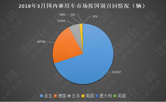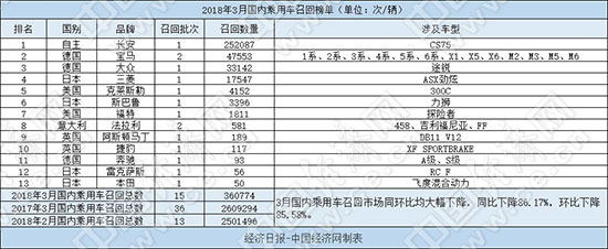 根據(jù)國家質(zhì)檢總局缺陷產(chǎn)品管理中心3月份發(fā)布的召回公告,經(jīng)濟(jì)日?qǐng)?bào)-中國經(jīng)濟(jì)網(wǎng)汽車頻道經(jīng)過匯總、統(tǒng)計(jì),整理出“2018年3月國內(nèi)乘用車召回榜單”。3月,國內(nèi)乘用車市場共有13個(gè)品牌發(fā)布15次召回公告,累計(jì)召回汽車360774輛,召回?cái)?shù)量同環(huán)比均出現(xiàn)大幅下降,其中同比下降86.17%,環(huán)比下降85.58%。