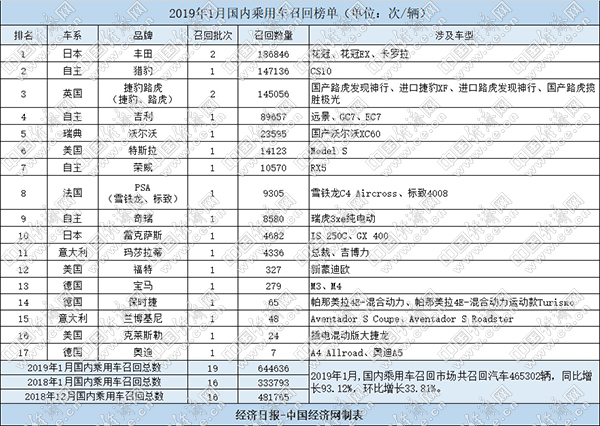 根據(jù)國(guó)家市場(chǎng)監(jiān)督管理總局缺陷產(chǎn)品管理中心1月份發(fā)布的召回公告,經(jīng)濟(jì)日?qǐng)?bào)-中國(guó)經(jīng)濟(jì)網(wǎng)汽車頻道經(jīng)過匯總、統(tǒng)計(jì),整理出“2019年1月國(guó)內(nèi)乘用車召回榜單”。1月,國(guó)內(nèi)乘用車市場(chǎng)發(fā)布19起召回公告,共涉及19個(gè)品牌的644636輛汽車,同比增長(zhǎng)93.12%,環(huán)比增長(zhǎng)33.81%。