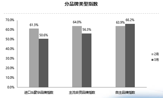 品牌方面,進(jìn)口&豪華品牌、合資品牌指數(shù)較上月有所下降;自主品牌指數(shù)則居高不下。郎學(xué)紅表示,雖然庫存預(yù)警指數(shù)整體較高,但是進(jìn)口&豪華品牌已經(jīng)接近臨界值,品牌分化現(xiàn)象變得愈加明顯。