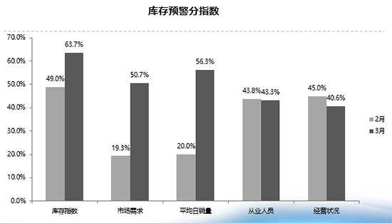 從庫存預(yù)警分指數(shù)來看,庫存指數(shù)、市場需求指數(shù)、平均日銷量指數(shù)環(huán)比上升;從業(yè)人員指數(shù)、經(jīng)營狀況指數(shù)環(huán)比下降。郎學(xué)紅表示,市場需求和日均銷量有明顯提升,然而由于經(jīng)銷商主動增加庫存和增值稅調(diào)整帶來的消費(fèi)者觀望,使得經(jīng)營狀況并未出現(xiàn)好轉(zhuǎn)。