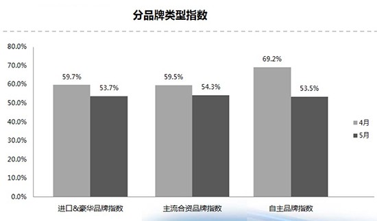 從數(shù)據(jù)上看,5月北區(qū)庫存預警指數(shù)為54.7%,東區(qū)指數(shù)為49.4%,南區(qū)指數(shù)58%,西區(qū)指數(shù)56.9%。分品牌來看,5月進口&豪華品牌指數(shù)、合資品牌指數(shù)、自主品牌指數(shù)較上月下降;另由于部分省市7月1日提前實施國六標準,5月經(jīng)銷商加大了對國五車清庫力度,總體庫存水平有所下降。