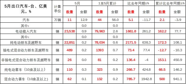 與整體市場(chǎng)相比,新能源車型出口表現(xiàn)更加突出。數(shù)據(jù)顯示,5月新能源汽車出口2.35萬(wàn)輛,同比增長(zhǎng)1661.8%;1-5月,新能源汽車出口8萬(wàn)輛,同比增長(zhǎng)162.2%。