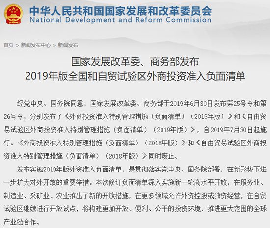 昨日,國(guó)家發(fā)展改革委、商務(wù)部連續(xù)發(fā)布了第25號(hào)令、第26號(hào)令和第27號(hào)令,分別發(fā)布了《外商投資準(zhǔn)入特別管理措施(負(fù)面清單)(2019年版)》(以下簡(jiǎn)稱(chēng)《外資準(zhǔn)入負(fù)面清單》)、《自由貿(mào)易試驗(yàn)區(qū)外商投資準(zhǔn)入特別管理措施(負(fù)面清單)(2019年版)》(以下簡(jiǎn)稱(chēng)《自貿(mào)試驗(yàn)區(qū)負(fù)面清單》)以及《鼓勵(lì)外商投資產(chǎn)業(yè)目錄(2019年版)》(以下簡(jiǎn)稱(chēng)《外商投資目錄》)。