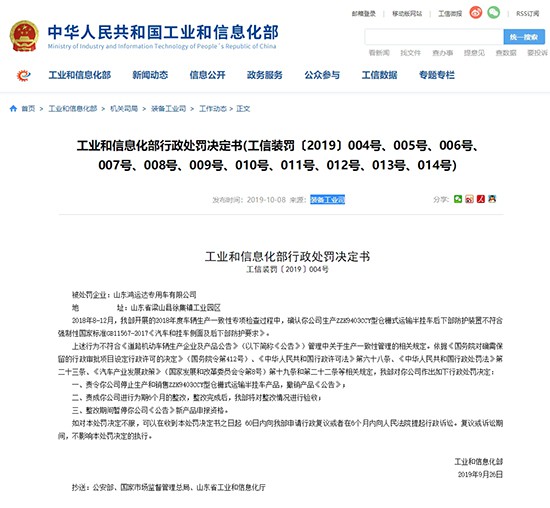 經(jīng)濟(jì)日報(bào)-中國經(jīng)濟(jì)網(wǎng)10月8日訊(記者 郭躍)今日,工業(yè)和信息化部(以下簡稱“工信部”)發(fā)布公告,對11家不符合《道路機(jī)動(dòng)車輛生產(chǎn)企業(yè)及產(chǎn)品公告》(以下簡稱《公告》)管理中關(guān)于生產(chǎn)一致性管理相關(guān)規(guī)定的公司進(jìn)行行政處罰。處罰內(nèi)容包括停止以上11家公司生產(chǎn)和銷售違規(guī)產(chǎn)品,并撤銷產(chǎn)品《公告》;責(zé)成以上公司進(jìn)行為期6個(gè)月的整改;同時(shí),整改期間暫停公司《公告》新產(chǎn)品申報(bào)資格。
