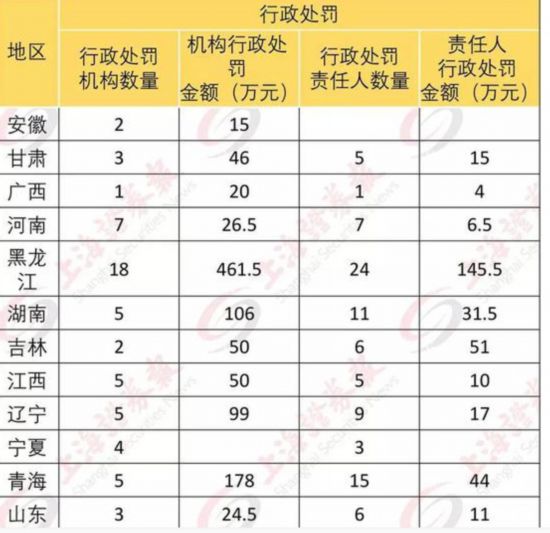 處罰機構(gòu)5個以上的地區(qū)有:黑龍江(處罰機構(gòu)18個,對機構(gòu)罰款合計461.5萬元;處罰責(zé)任人24個,對責(zé)任人罰款合計145.5萬元);重慶(處罰機構(gòu)10個,對機構(gòu)罰款合計348萬元;處罰責(zé)任人15個,對責(zé)任人罰款合計131萬元)。