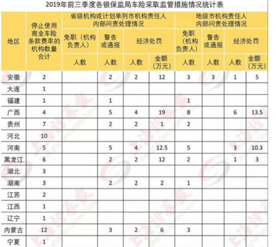2019年前三季度各銀保監(jiān)局車險行政處罰情況統(tǒng)計表