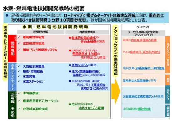 該戰(zhàn)略著眼于三大技術(shù)領(lǐng)域:燃料電池技術(shù)領(lǐng)域、氫供應(yīng)鏈領(lǐng)域和電解技術(shù)領(lǐng)域,確定了包括車載用燃料電池、定置用燃料電池、大規(guī)模制氫、水制氫等10個項目作為優(yōu)先領(lǐng)域,并通過互相合作來促進技術(shù)的研究與開發(fā)。