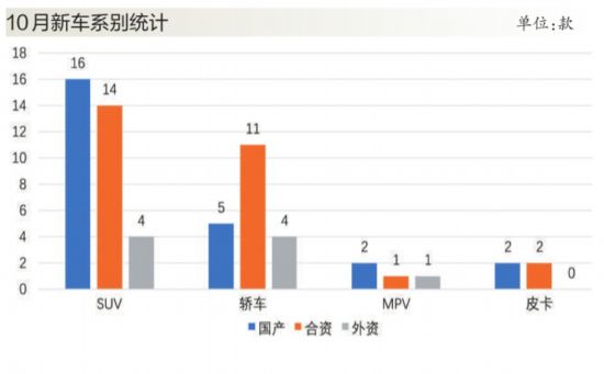 10月合資品牌推出的新車數(shù)量超過自主品牌。在轎車領(lǐng)域,合資產(chǎn)品仿佛回到了主場。其中在日系和德系車強勢的背景下,韓系車明顯加快了投放新品的節(jié)奏。據(jù)記者統(tǒng)計,轎車中合資品牌共有菲斯塔、寶來純電等11款新車上市,而自主品牌僅有長安銳程CC等5款新車。一向以SUV市場為主陣地的自主品牌,10月推出長安CS35等16款車型,在SUV新車數(shù)量上,自主品牌僅比合資品牌多出兩款車型。而外資品牌推出的新車則主要分布在高端車和跑車領(lǐng)域,共有12款新車上市。