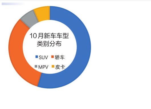 10月有34款SUV新車上市,占比由上月的57%微降至55%。轎車新車共有20款,占比由上月的34%降至32%。10月上市的MPV和皮卡均為4款,MPV車型占比同樣有小幅下滑,但全新車型比較吸引眼球。自2017年以來,國內(nèi)MPV市場持續(xù)較大幅度下滑,即便是過去一枝獨秀的上汽通用五菱也在今年出現(xiàn)了下滑。面對慘淡的車市,一直主攻低端市場的上汽通用五菱推出五菱宏光的升級版五菱宏光PLUS,其整體設計更為年輕、時尚,完全顛覆了以往消費者對其產(chǎn)品的廉價印象。而皮卡新車占比為6%,是惟一實現(xiàn)占比正增長的車型類別,其中,長安凱程F70是長安與PSA集團合作開發(fā)的全新皮卡產(chǎn)品。