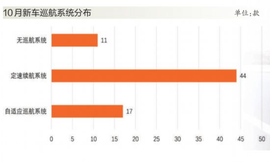 自適應巡航系統(tǒng)在緩解疲勞和保障安全上有明顯優(yōu)勢,在10月上市車型中,搭載該系統(tǒng)的新車有17款,如新款東風日產(chǎn)天籟、一汽豐田榮放、長安CS35、WEY VV5、吉利遠景X6以及理想ONE等車型,均搭載有自適應巡航系統(tǒng),甚至是全速自適應巡航系統(tǒng)。與以往相比,自適應巡航技術(shù)的滲透率有所提升,而定速巡航的應用則更為廣泛,在各級別車型中均有分布。10月,搭載定速巡航的新車總數(shù)為44款,而不搭載任何巡航系統(tǒng)的車型共有11款,主要體現(xiàn)在定位較低車型上。