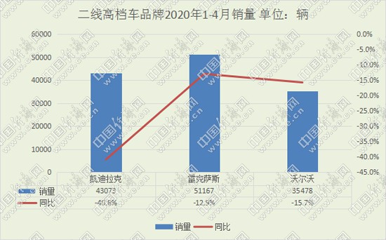 4月,二線高檔車市場呈現(xiàn)加速回升之勢,凱迪拉克、雷克薩斯、沃爾沃均實現(xiàn)同比正增長,為二季度發(fā)展奠定良好開局。從前4月來看,雷克薩斯率先突破5萬輛,并將其與凱迪拉克的銷量差距拉大至8000余輛。