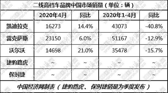 得益于抗疫形勢持續(xù)向好,復工復產加快推進,4月二線高檔車市場呈現(xiàn)加速回升之勢。其中,按照月度公布銷量的三大品牌,4月均實現(xiàn)同比正增長,凱迪拉克、沃爾沃增幅更是達到兩位數(shù),而雷克薩斯也有著6%的上升,為二季度發(fā)展奠定良好開局。