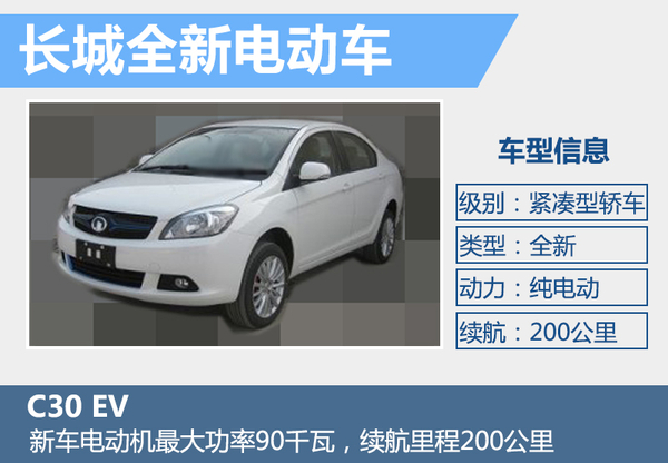 根據(jù)長城汽車此前公布消息,旗下首款純電動轎車將于2016年上市。網(wǎng)通社獲得了一組長城全新電動車型C30 EV的諜照及部分信息,新車外觀方面較燃油版車型在細節(jié)方面進行調(diào)整,加入更多“EV”元素。新車搭載一臺功率為90千瓦的電動機,續(xù)航里程有望達到200公里。