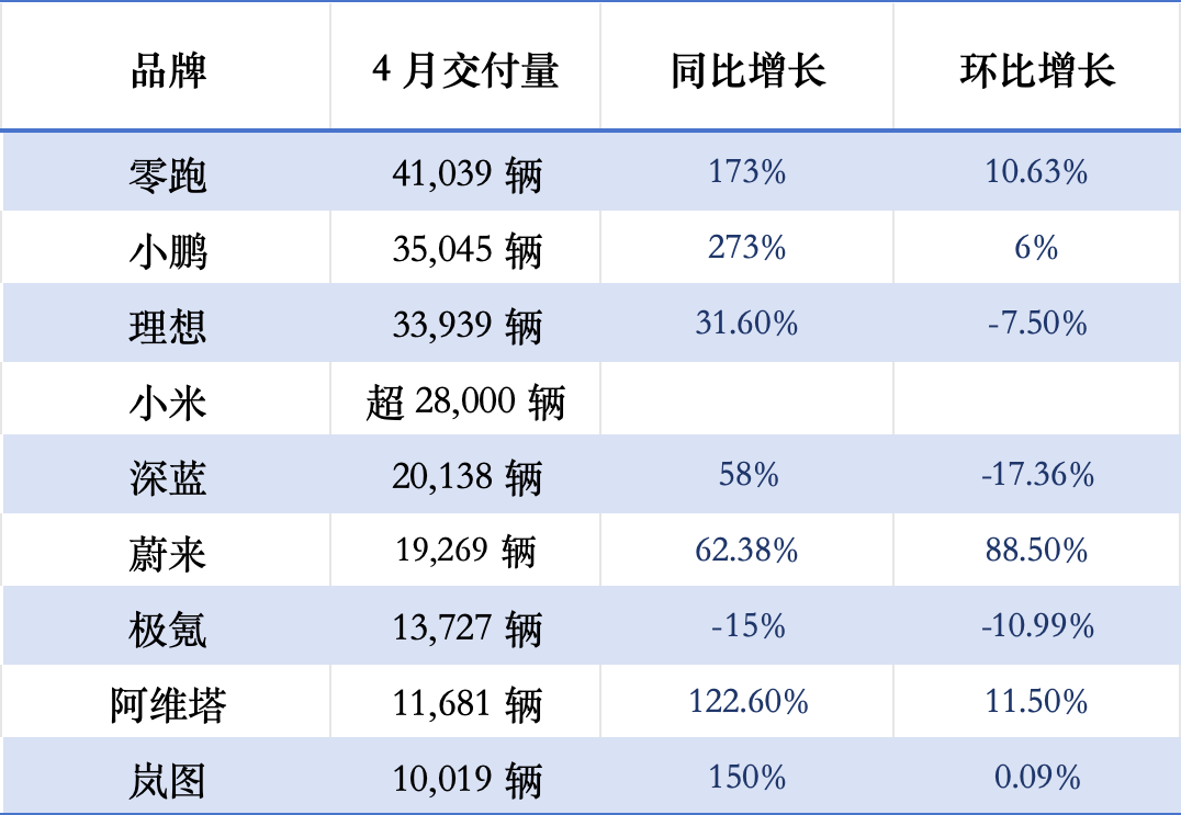 新勢力4月盤點:5個品牌單月交付超2萬輛,極氪同比環(huán)比雙降