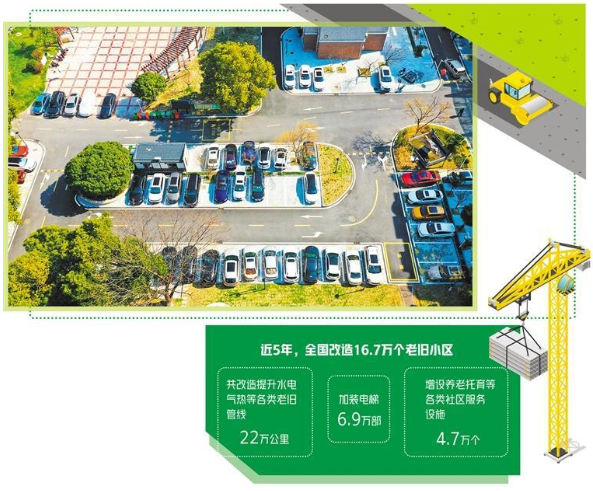 近年來,老舊小區(qū)改造取得積極進展。住房和城鄉(xiāng)建設(shè)部最新統(tǒng)計數(shù)據(jù)顯示,近年來,各地在老舊小區(qū)改造中,共改造提升水電氣熱等各類老舊管線22萬公里,加裝電梯6.9萬部,增設(shè)停車位240萬個、電動汽車充電樁6.8萬個,增設(shè)養(yǎng)老托育等各類社區(qū)服務(wù)設(shè)施4.7萬個。