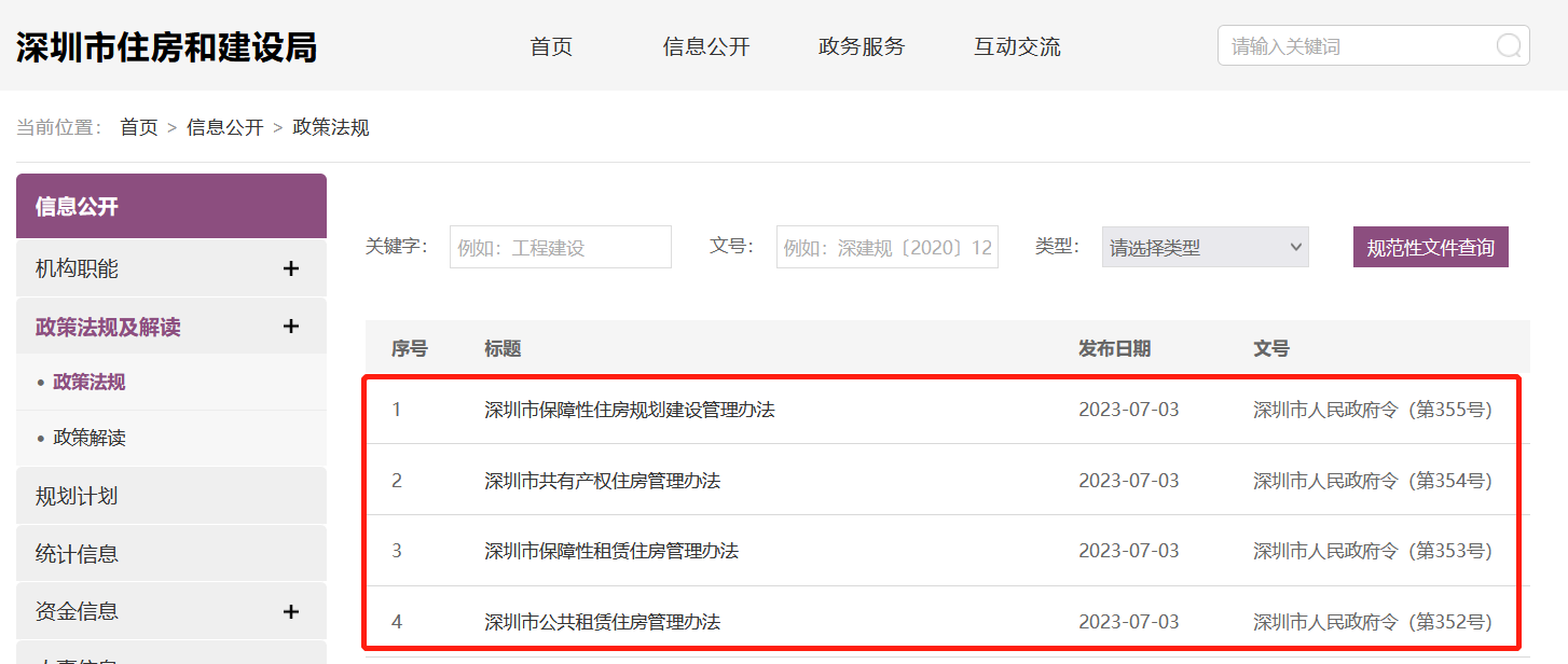 央廣網(wǎng)北京7月5日消息 據(jù)深圳市住房和建設(shè)局網(wǎng)站消息,7月3日,深圳市住建局發(fā)布《深圳市公共租賃住房管理辦法》《深圳市保障性租賃住房管理辦法》《深圳市共有產(chǎn)權(quán)住房管理辦法》《深圳市保障性住房規(guī)劃建設(shè)管理辦法》,具體來看,上述四項管理辦法,分別對公共租賃住房、共有產(chǎn)權(quán)住房、保障性租賃住房等三類住房的保障對象、申請條件、供應分配方式、租售價格標準、用地保障、建設(shè)籌集主體和渠道、建設(shè)標準、監(jiān)督管理等進行了規(guī)范。四項管理辦法將于8月1日正式實施。