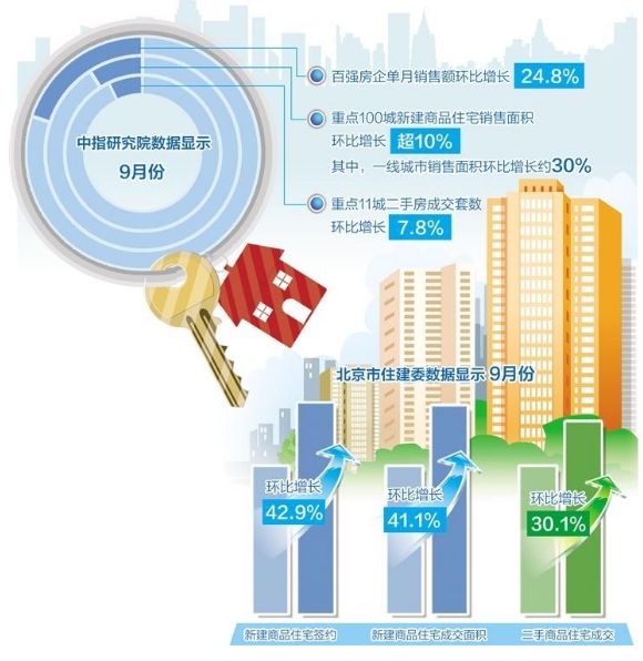 隨著需求釋放動能減弱,9月后兩周成交量明顯下降。北京市住建委數據顯示,9月份,北京新建商品住宅簽約5891套,成交面積67.96萬平方米,環(huán)比分別增長42.9%和41.1%;二手商品住宅成交14262套,環(huán)比增長30.1%。