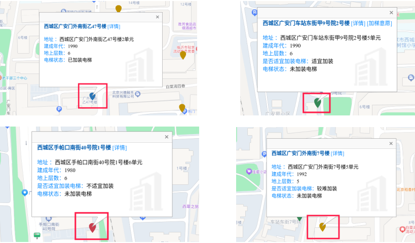 點(diǎn)擊地圖即可查看樓棟加梯的相關(guān)信息