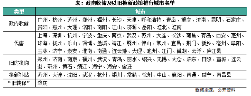 在中央政策的支持下,已有越來越多的城市鼓勵國有企業(yè)進場,收購二手舊房用于保障房或者市場化租賃用途,部分城市已有落地的方案,如安徽宣城城市建設(shè)集團發(fā)布商品房以舊換新公告;武漢硚口城市更新公司深度參與,購房者舊房由區(qū)國企進行收購,試點“以房換房”;南京市安居建設(shè)集團啟動主城六區(qū)存量住房“以舊換新”試點……