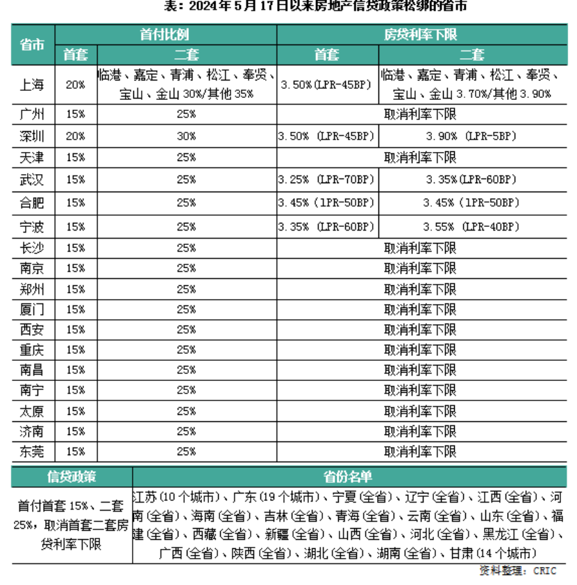 5月17日,央行將首套、二套房首付比例下限再下調(diào)5個百分點,調(diào)整后分別為15%、25%。此后據(jù)克而瑞研究中心統(tǒng)計,山東、福建、河南等超22個省份已經(jīng)落地執(zhí)行,全國超過200個城市15%首套房最低首付比例。