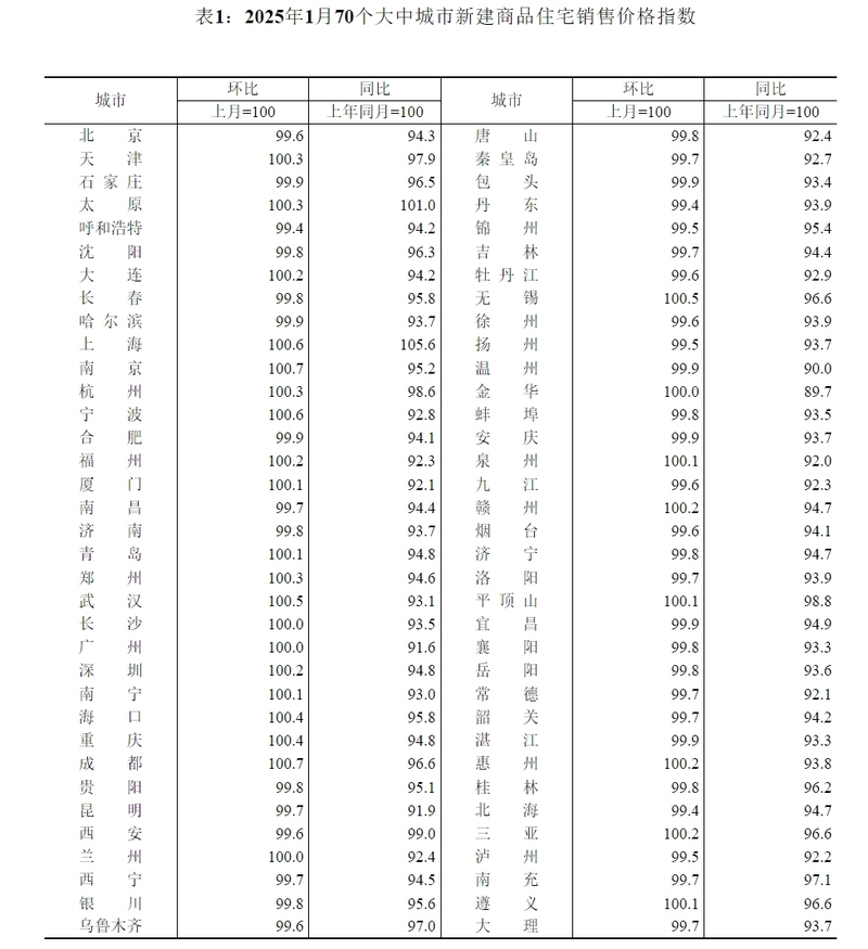 2025年開(kāi)年,各線(xiàn)城市房?jī)r(jià)走勢(shì)如何?2月19日,國(guó)家統(tǒng)計(jì)局發(fā)布2025年1月份商品住宅銷(xiāo)售價(jià)格變動(dòng)情況統(tǒng)計(jì)數(shù)據(jù)顯示,一、二線(xiàn)熱點(diǎn)城市穩(wěn)步邁入“止跌回穩(wěn)”。 國(guó)家統(tǒng)計(jì)局城市司首席統(tǒng)計(jì)師王中華解讀稱(chēng):“2025年1月份,70個(gè)大中城市中,一線(xiàn)城市商品住宅銷(xiāo)售價(jià)格環(huán)比繼續(xù)上漲,二三線(xiàn)城市環(huán)比總體略降;一二三線(xiàn)城市同比降幅均持續(xù)收窄?!?/p> 二線(xiàn)城市新房房?jī)r(jià)環(huán)比一年半來(lái)首次“轉(zhuǎn)正” 今年開(kāi)年,二線(xiàn)核心城市房?jī)r(jià)呈現(xiàn)“止跌回穩(wěn)”態(tài)勢(shì),這是1月70城房?jī)r(jià)數(shù)據(jù)的最大亮點(diǎn)。 國(guó)家統(tǒng)計(jì)局?jǐn)?shù)據(jù)顯示,今年1月份,二線(xiàn)城市新建商品住宅銷(xiāo)售價(jià)格環(huán)比由上月持平轉(zhuǎn)為上漲0.1%,為2023年6月以來(lái)首次上漲。 新京報(bào)貝殼財(cái)經(jīng)記者對(duì)比發(fā)現(xiàn),南京、成都1月份新房房?jī)r(jià)環(huán)比增幅均上漲0.7%,位居全國(guó)第一。此外,寧波、武漢、無(wú)錫等二線(xiàn)城市新房房?jī)r(jià)漲幅也居于5%(含)之上。 58安居客研究院院長(zhǎng)張波分析稱(chēng):“二線(xiàn)城市新房?jī)r(jià)格環(huán)比由持平轉(zhuǎn)為上漲0.1%,是自2023年6月以來(lái)首次轉(zhuǎn)正,這一變化值得關(guān)注,尤其是南京、杭州、成都、武漢的回升動(dòng)力更強(qiáng),也是本輪復(fù)蘇的帶頭城市?!?/p> 同時(shí),一線(xiàn)城市新房房?jī)r(jià)也維持回溫態(tài)勢(shì)。1月份,一線(xiàn)城市新建商品住宅銷(xiāo)售價(jià)格環(huán)比上漲0.1%,漲幅比上月回落0.1個(gè)百分點(diǎn)。其中,北京下降0.4%,廣州持平,上海和深圳分別上漲0.6%和0.2%。 “樓市繼續(xù)暖冬行情,但熱度有所降低。”中原地產(chǎn)首席分析師張大偉表示:“一線(xiàn)城市出現(xiàn)了連續(xù)4個(gè)月上漲,但隨著價(jià)格的上漲,購(gòu)房者開(kāi)始出現(xiàn)分化,部分購(gòu)房者再次開(kāi)始觀望,在此情況下,2025年1月份一線(xiàn)城市的房?jī)r(jià)漲幅開(kāi)始放緩。” 從房?jī)r(jià)漲跌城市數(shù)量來(lái)看,1月份,70個(gè)大中城市中,新建商品住宅銷(xiāo)售價(jià)格環(huán)比上漲城市有24個(gè),比上月增加1個(gè);二手住宅環(huán)比上漲城市有7個(gè),比上月減少2個(gè)。