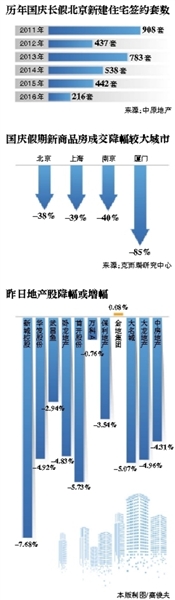 北京在9月30日出臺的政策影響了市場熱度,市場進入了急速冷凍階段。中原地產(chǎn)研究中心統(tǒng)計數(shù)據(jù)顯示,2016年國慶長假期間,7天北京新建住宅簽約216套,二手房住宅簽約209套。合計簽約425套。而2015年國慶7天簽約為543套。從簽約數(shù)據(jù)看,北京新建住宅成交量為2011年來6年最低點。對此,中原地產(chǎn)首席分析師張大偉分析認為,預計北京房價將快速降溫,四季度漲幅將明顯放緩,在自住房大量供應(yīng)后,部分區(qū)域的價格很可能出現(xiàn)調(diào)整。