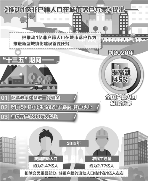 如何推動1億左右農業(yè)轉移人口和其他常住人口等非戶籍人口在城市落戶,使有能力在城鎮(zhèn)穩(wěn)定就業(yè)和生活的農業(yè)轉移人口舉家進城落戶,是我國推進新型城鎮(zhèn)化面臨的迫切任務。不久前,國務院辦公廳印發(fā)了《推動1億非戶籍人口在城市落戶方案》(以下簡稱《方案》)。