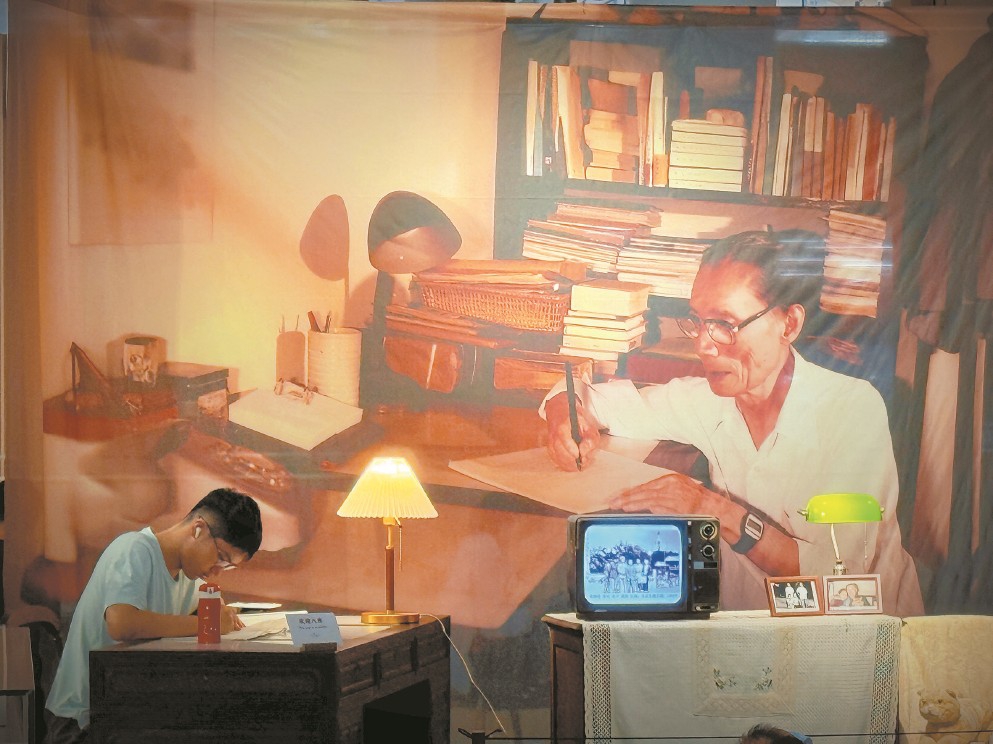 上圖東館手稿主題館展覽現(xiàn)場(chǎng),小讀者在主視覺(jué)區(qū)的仿真書桌與夏衍“對(duì)坐”。(主辦方供圖)