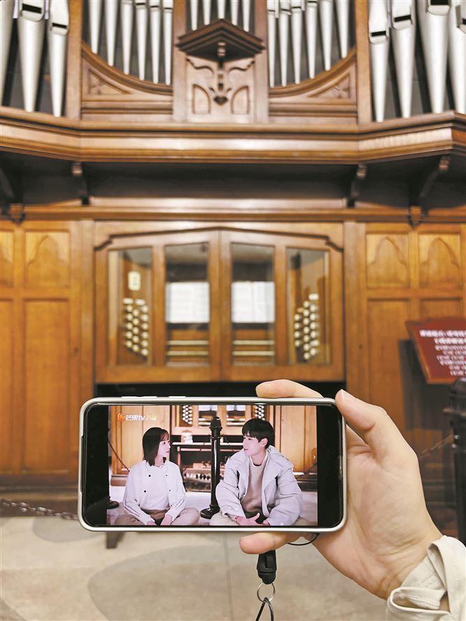 來鼓浪嶼打卡的游客將劇照和現(xiàn)場對比,拍照留念。
