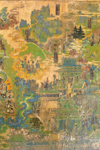 但巖山寺金代壁畫有確切年代,是御前承應(yīng)畫匠王逵用10年時間才完成這一煌煌巨制。800多年前,王逵面對四壁,決然舍棄慣常的連環(huán)畫形式,大膽?yīng)殑?chuàng),采用滿幅構(gòu)圖形式,以一組繁雜的宮廷建筑為中心,配以各種故事情節(jié)畫面,然后用山水、樹石、云嵐連結(jié),細(xì)部真實(shí),透視準(zhǔn)確,遠(yuǎn)看儼然一幅氣勢磅礴的大型山水畫,近瞧卻又章回分明。壁畫上就有多處使用瀝粉堆金裝飾,顯現(xiàn)金碧輝煌、富麗非凡的效果。這樣大面積的工筆重彩畫,一絲不茍,找不到起稿與粉本痕跡,而且線條變化多樣,無一廢筆,令人驚嘆。