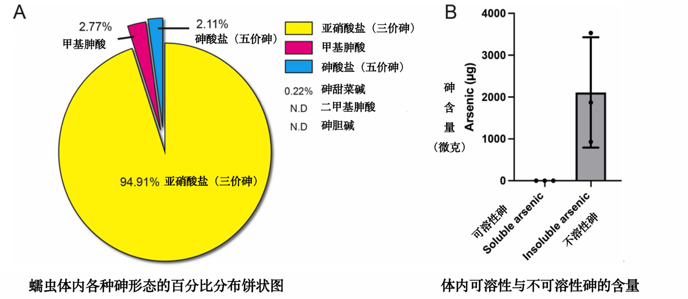 A:蠕蟲體內(nèi)各種砷形態(tài)的百分比分布;B:體內(nèi)可溶性與不可溶性砷的含量