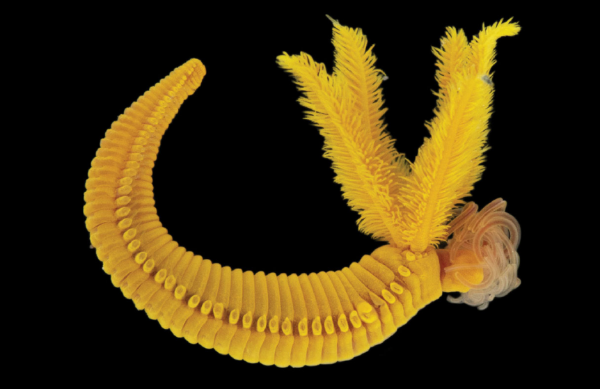 那么,為什么這種蠕蟲卻沒有被毒死?這得從它那身明亮的黃色說(shuō)起。在深海的永恒黑暗中,大多數(shù)生物都是灰白色或深紅色,蠕蟲這身黃色便十分顯眼。