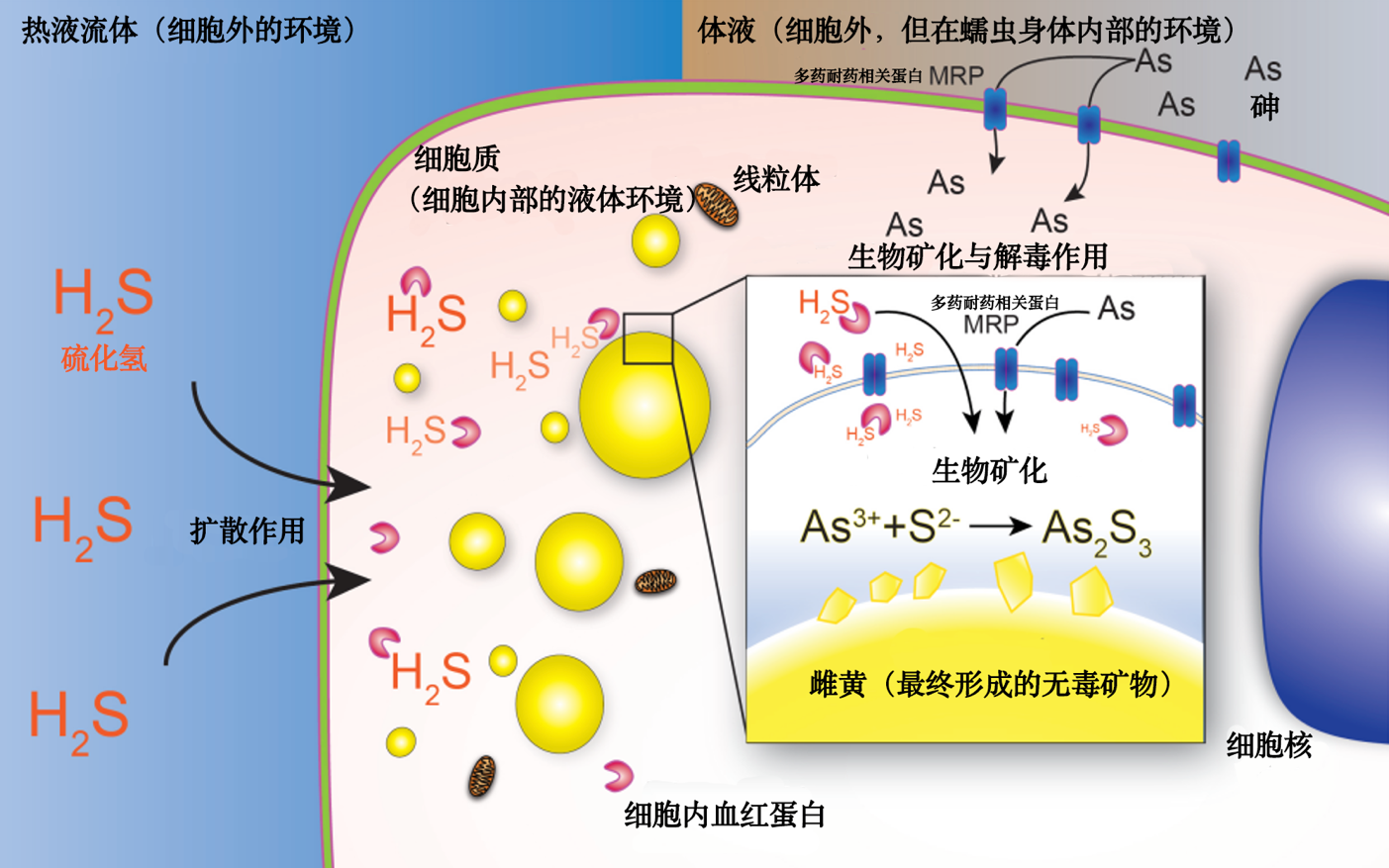 至此,兩種致命的毒物在“與世隔絕”的囊泡“反應(yīng)倉(cāng)”內(nèi)相遇了。在這個(gè)由雙層脂質(zhì)膜包裹的封閉空間里,環(huán)境被細(xì)胞精確調(diào)控:這里是還原性的、低溫的,且pH值接近中性。這些條件恰好是促進(jìn)砷和硫化氫發(fā)生化學(xué)反應(yīng),形成穩(wěn)定、不溶于水的雌黃晶體的最佳環(huán)境。于是,兩種液態(tài)的、高活性、高毒性的物質(zhì),就此結(jié)合成了一種固態(tài)的、惰性的、相對(duì)無(wú)害的礦物。毒性被永久地“鎖定”在了晶體結(jié)構(gòu)中。