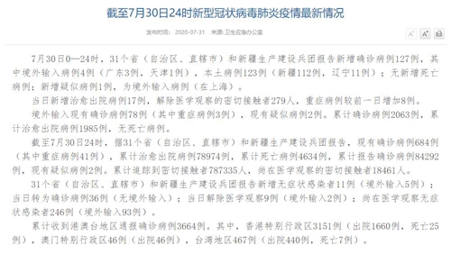 人民網(wǎng)北京7月31日電(董童)國(guó)家衛(wèi)生健康委于今日在官網(wǎng)發(fā)布的《截至7月30日24時(shí)新型冠狀病毒肺炎疫情最新情況》(以下簡(jiǎn)稱“情況”)提出,7月30日0—24時(shí),31個(gè)?。ㄗ灾螀^(qū)、直轄市)和新疆生產(chǎn)建設(shè)兵團(tuán)報(bào)告新增確診病例127例,其中境外輸入病例4例(廣東3例,天津1例),本土病例123例(新疆112例,遼寧11例);無(wú)新增死亡病例;新增疑似病例1例,為境外輸入病例(在上海)。當(dāng)日新增治愈出院病例17例,解除醫(yī)學(xué)觀察的密切接觸者279人,重癥病例較前一日增加8例。