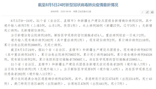 人民網(wǎng)北京8月6日電(董童)國(guó)家衛(wèi)生健康委于今日在官網(wǎng)發(fā)布的《截至8月5日24時(shí)新型冠狀病毒肺炎疫情最新情況》(以下簡(jiǎn)稱“情況”)提出,8月5日0—24時(shí),31個(gè)?。ㄗ灾螀^(qū)、直轄市)和新疆生產(chǎn)建設(shè)兵團(tuán)報(bào)告新增確診病例37例,其中境外輸入病例7例(上海5例,山東1例,陜西1例),本土病例30例(新疆27例,遼寧3例);無新增死亡病例;無新增疑似病例。當(dāng)日新增治愈出院病例10例,解除醫(yī)學(xué)觀察的密切接觸者474人,重癥病例較前一日減少2例。