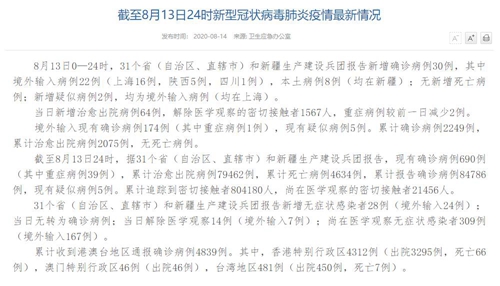 情況顯示,截至8月13日24時(shí),據(jù)31個(gè)?。ㄗ灾螀^(qū)、直轄市)和新疆生產(chǎn)建設(shè)兵團(tuán)報(bào)告,現(xiàn)有確診病例690例(其中重癥病例39例),累計(jì)治愈出院病例79462例,累計(jì)死亡病例4634例,累計(jì)報(bào)告確診病例84786例,現(xiàn)有疑似病例5例。累計(jì)追蹤到密切接觸者804180人,尚在醫(yī)學(xué)觀察的密切接觸者21456人。