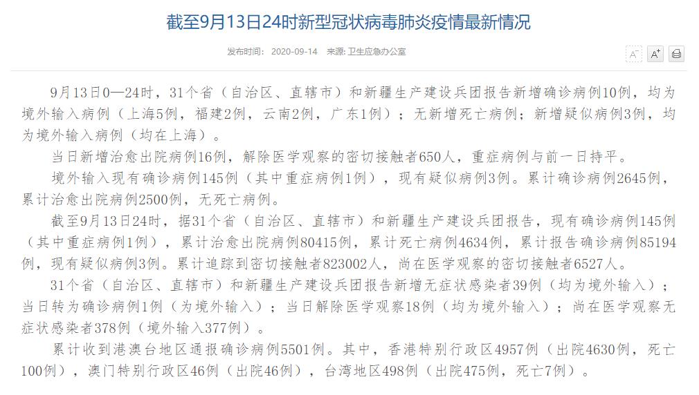 人民網(wǎng)北京9月14日(董童)國家衛(wèi)生健康委于今日在官網(wǎng)發(fā)布的《截至9月13日24時(shí)新型冠狀病毒肺炎疫情最新情況》(以下簡稱“情況”)提出,9月13日0—24時(shí),31個省(自治區(qū)、直轄市)和新疆生產(chǎn)建設(shè)兵團(tuán)報(bào)告新增確診病例10例,均為境外輸入病例(上海5例,福建2例,云南2例,廣東1例);無新增死亡病例;新增疑似病例3例,均為境外輸入病例(均在上海)。當(dāng)日新增治愈出院病例16例,解除醫(yī)學(xué)觀察的密切接觸者650人,重癥病例與前一日持平。