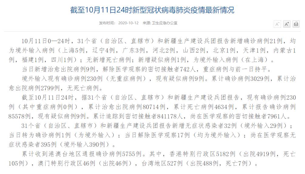 人民網(wǎng)北京10月12日電(董童)國家衛(wèi)生健康委于今日在官網(wǎng)發(fā)布的《截至10月11日24時(shí)新型冠狀病毒肺炎疫情最新情況》(以下簡稱“情況”)提出,10月11日0—24時(shí),31個(gè)?。ㄗ灾螀^(qū)、直轄市)和新疆生產(chǎn)建設(shè)兵團(tuán)報(bào)告新增確診病例21例,均為境外輸入病例(上海5例,遼寧4例,廣東3例,河北2例,山西2例,北京1例,天津1例,內(nèi)蒙古1例,福建1例,四川1例);無新增死亡病例;新增疑似病例1例,為境外輸入病例(在上海)。當(dāng)日新增治愈出院病例9例,解除醫(yī)學(xué)觀察的密切接觸者742人,重癥病例與前一日持平。