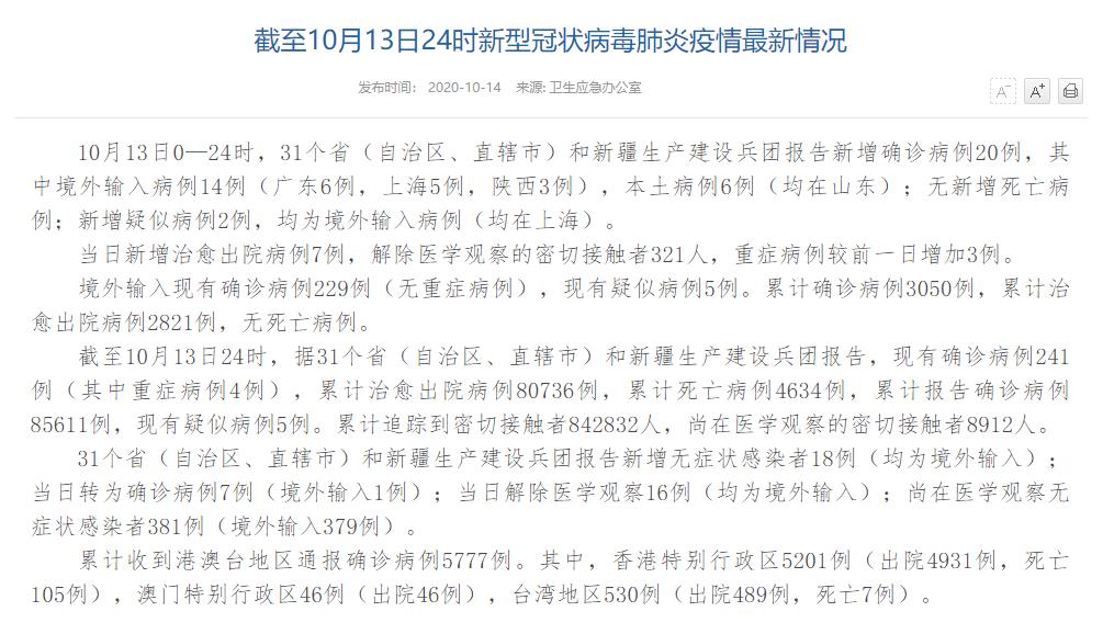 人民網(wǎng)北京10月14日電(董童)國家衛(wèi)生健康委于今日在官網(wǎng)發(fā)布的《截至10月13日24時新型冠狀病毒肺炎疫情最新情況》(以下簡稱“情況”)稱,10月13日0—24時,31個省(自治區(qū)、直轄市)和新疆生產(chǎn)建設(shè)兵團(tuán)報告新增確診病例20例,其中境外輸入病例14例(廣東6例,上海5例,陜西3例),本土病例6例(均在山東);無新增死亡病例;新增疑似病例2例,均為境外輸入病例(均在上海)。當(dāng)日新增治愈出院病例7例,解除醫(yī)學(xué)觀察的密切接觸者321人,重癥病例較前一日增加3例。