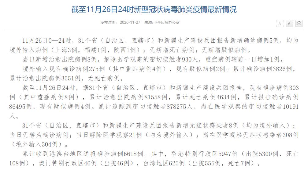 人民網(wǎng)北京11月27日電(董童)國家衛(wèi)生健康委于今日在官網(wǎng)發(fā)布的《截至11月26日24時(shí)新型冠狀病毒肺炎疫情最新情況》(以下簡稱“情況”)指出,11月26日0—24時(shí),31個(gè)省(自治區(qū)、直轄市)和新疆生產(chǎn)建設(shè)兵團(tuán)報(bào)告新增確診病例5例,均為境外輸入病例(上海3例,福建1例,陜西1例);無新增死亡病例;無新增疑似病例。當(dāng)日新增治愈出院病例8例,解除醫(yī)學(xué)觀察的密切接觸者930人,重癥病例較前一日增加1例。