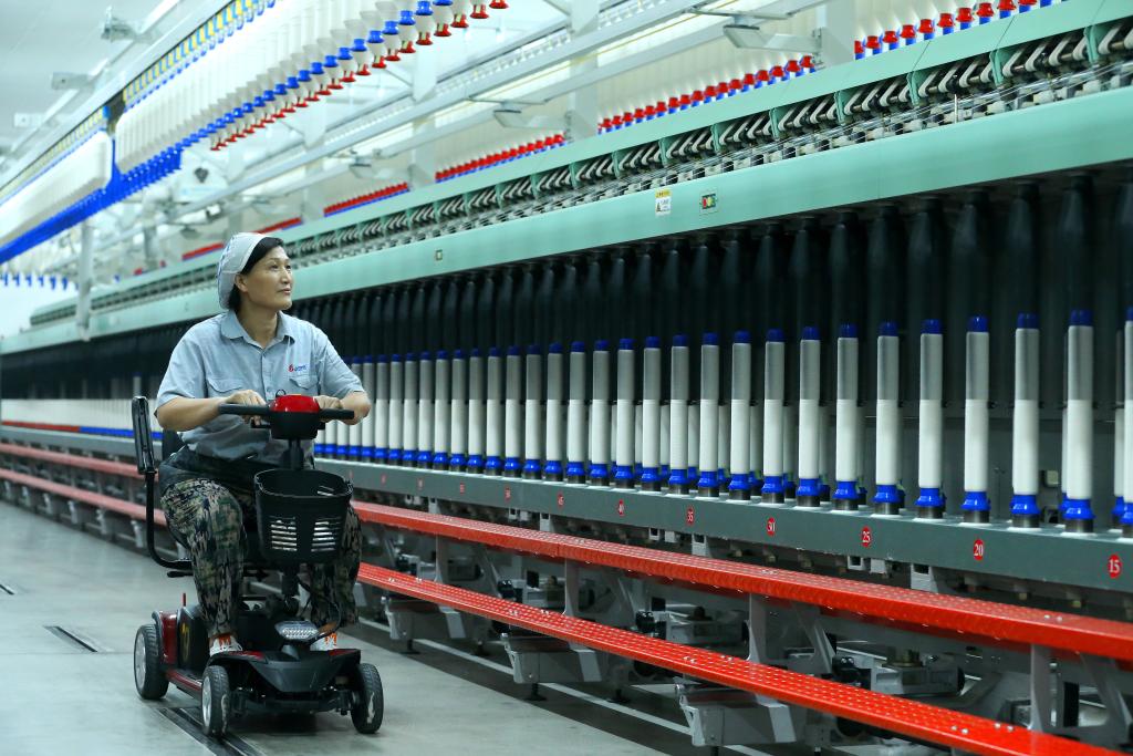 7月30日,山東省青島市一家科技紡織企業(yè)的工人在智慧紡紗生產(chǎn)線上巡檢。新華社發(fā)(梁孝鵬攝)