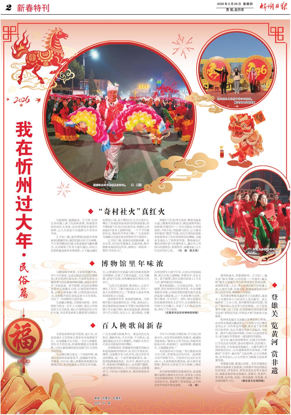 馬踏春暉開新景,文旅煥彩譜華章。丙午馬年新春,走進(jìn)定襄縣河邊民俗博物館,喜慶氛圍撲面而來,只見特色新春主題景觀與民俗展演相映成趣,游客往來有序、笑意盈盈。春節(jié)假期,河邊民俗博物館緊扣文旅融合主線,以規(guī)范接待樹形象、以暖心服務(wù)贏口碑、以特色演出添活力,全面提升景區(qū)游覽品質(zhì)與文化體驗(yàn),交出了一份亮眼的文旅答卷。