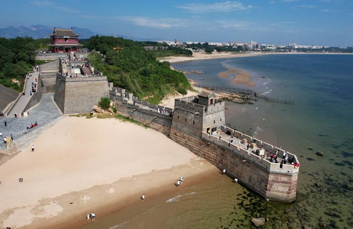 2024年9月19日,游客在秦皇島市山海關(guān)區(qū)老龍頭景區(qū)游覽(無人機(jī)照片)。新華社記者 楊世堯 攝