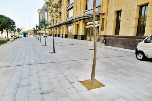 據(jù)了解,因為該臨街大樓是轉(zhuǎn)角建筑,相鄰七一路樓前還栽有13棵景觀樹,工人們將在7日下午為這些樹木切割設(shè)置相同規(guī)格的樹池。圖為有了澆水池的樹木(魯明強)