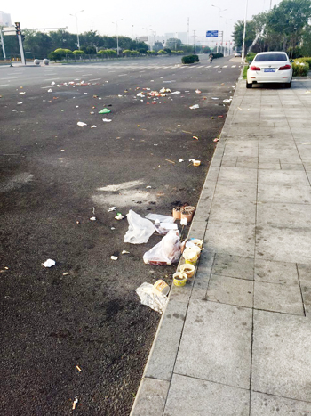 城區(qū)高鐵廣場前,慕山路與雁門大道丁字路口,每天晚上有小商販在此經(jīng)營,本無可厚非,但每天產(chǎn)生的垃圾,既影響市容環(huán)境,還給環(huán)衛(wèi)工人增加了工作量,呼吁市民及小商販愛護(hù)環(huán)境,也希望相關(guān)部門管理維護(hù)公共環(huán)境。一網(wǎng)友攝于8月22日
